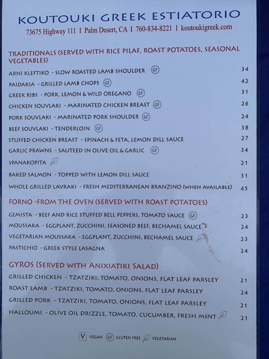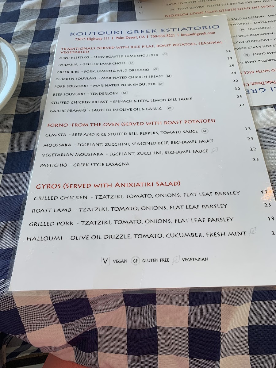 Welcome to Koutouki Greek Estiatorio, a hidden gem in Palm Desert, CA, that offers a true taste of Greece right in the heart of California. This charming Greek restaurant boasts a wide range of amenities, including outdoor seating, wheelchair accessibility, and even an EV charging station. With a diverse menu that caters to all dietary preferences, from vegan options to a plethora of vegetarian dishes, Koutouki Greek Estiatorio is sure to please every palate.