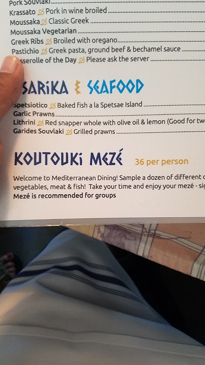 My wife and I enjoyed a wonderful meal. Staff was friendly and attentive. Water was provided without asking. Our spanikopita app was fresh, seasoned mildly, and a generous portion. My wife and I both ordered moussaka, which was served hot in a bowl, best I've ever had. I would highly recommend it.